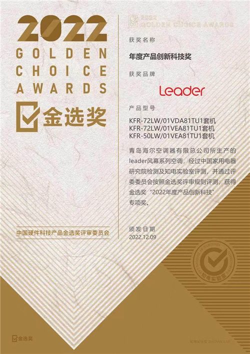 12月9日,金选奖将“2022年度产品创新科技奖”颁给了Leader风幕系列空调。该奖项的颁发,一方面让人们看到了Leader空调在科技创新上的优势,另一方面也为年轻人挑选科技含量更高的空调提供了参考。