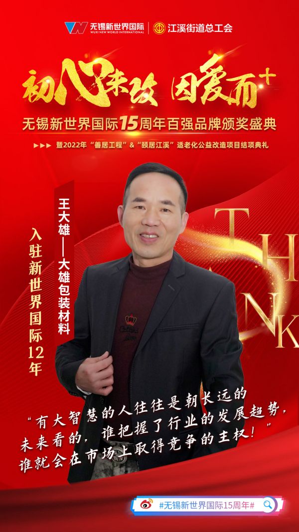 无锡新世界国际的发展离不开一群特别的人,他们与无锡新世界国际共行十余载,他们是无锡新世界国际发展的亲历者和见证者,在他们的身上,有岁月沉淀的厚重,亦有曾经沧海的淡然;有对生活的无限热爱,也有对事业的从容笃行;曾遭遇过危机,也享受过荣耀。在无锡新世界国际15周年之际,我们特别推出《新世界国际十五周年·商户说》访谈栏目,带大家走进他们的故事。第三期我们采访到无锡新世界国际商户王大雄(无锡大雄包装材料有限公司负责人),首先跟随着小编简单了解下商户王大雄(无锡大雄包装材料有限公司负责人):“王大雄,无锡新世界国际D标段B27-1无锡大雄包装材料有限公司老板,来无锡新世界国际12年了,他用创业几十年的经历践行了一句话:心有多大,世界就有多大;眼光有多长远,梦想就有多近;坚持有多长久,未来就有多美好。有大智慧的人往往是朝长远的未来看的,王大雄创业历程中做出的一个个重要的决定,造就了他现在的成功!接下来,让我们通过本期的访谈,深入了解一下无锡新世界国际商户·王大雄的故事。