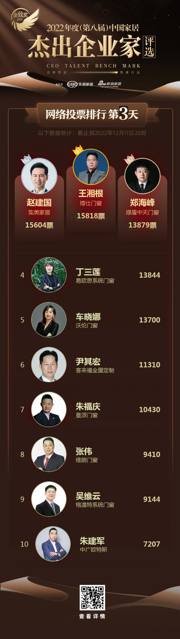 票选第三日,博仕门窗董事长王湘根以15818票荣登榜首的位置。作为博仕门窗的创始人、董事长,王湘根一步步将博仕打造为门窗行业的高价值品牌,成就了让业界称赞的“博仕速度”。