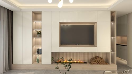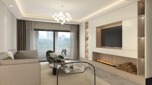 电视背景墙的设计是亮点之处,采用柜体分割的方式将整面墙壁利用起来,藏露有序的搭配,增加储物空间的同时,赋予空间空灵感, 与中间的电视区域交相辉映,底部壁炉更是此方空间的点睛之笔,营造出客厅潜藏的生命力,让电视背景墙看起来极具意境美。