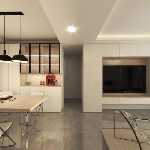 流淌着艺术气息的餐厅在格栅的衬托下,给予空间视觉延伸,提高整体美学格调。海尔全屋家居采用3C玻璃下搭配金属边框的餐边柜,彰显高雅唯美的艺术氛围。