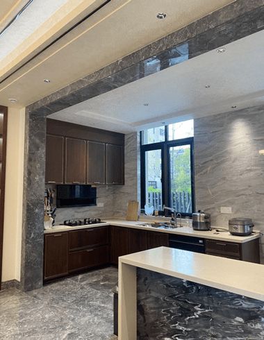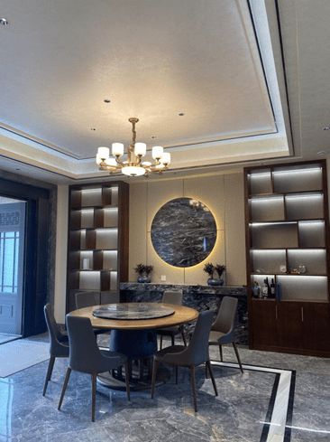 一个故事,之所以记忆深刻是因为客户的孝心。在风格上,他父母喜欢新中式,客户自己又特别中意现代,风格喜好上和父母存在很大差异,客户提出满足父母需求是第一位,那如何兼顾客户他本人的喜好呢?我认为这种看似是矛盾点其实完全可以通过设计来做到兼顾。另外对于空间布局上客户也存在纠结点,厨房空间太小、边上是卫生间又紧挨楼梯,看似没法改变。从整体效果出发,我建议将一楼卫生间取消来扩大楼梯间以及把厨房打通,并提出将原来餐厅的窗户封起,原先客户极力反对、不接受,后来通过找案例对照参考和反复沟通,最终我的设计方案被认可。我在风格上采用极具现代感的线条搭配中式的元素,最终完美呈现适合他们两代人的风格,目前客户已经入住,对于整体的布局设计以及整体的风格搭配也特别满意。