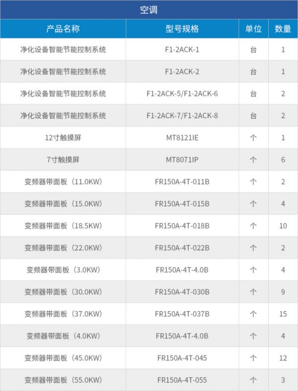 在空调系统设备方面,加装了6台净化设备智能节能控制系统、孚瑞肯4-75KW变频器带面板共60个、威纶通触摸屏及多个各类压差开关与传感器,经过调试验收,各项均合格通过,这使得厂区的环境发生了新的变化,由于末端的压差开关和传感器会自动搜集现场实际环境的参数如环境温湿度、空气污染过滤和流动程度、用水温度、空气压力、供回水压力和液位等,经过净化智能控制系统设定的最佳有效值自动调节电机频率、风管、水管的开关阀度,主机制冷制热量,当所在某个环境需求用能用水时,设备会根据人员与环境参数,识别增加热量冷量水量各方面的供给程度,当无人使用时,则会自动进入待机模式,从而达到节电、节水、净化输出的作用,提高了厂区环境干净度,人员身心健康值,运行工作效率等质量管理水平。