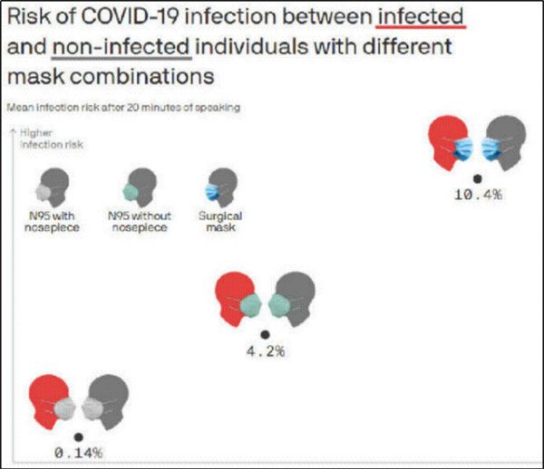 《美国科学院院报》PNAS做过一项研究,研究显示不同的口罩防止新冠传染的作用不同。如果一个人感染新冠不戴口罩,而他身边的健康者也不戴口罩,被感染的风险是100%;两个人都戴外科口罩,健康者的感染风险是10.4%;两个人都戴N95,如果都没戴服帖,健康者的感染风险是4.2%;两个人都戴N95,都戴得服服帖帖,那么健康者的感染风险是0.14%。
