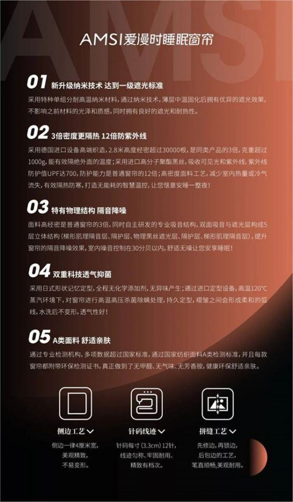 以爱漫时核心产品睡眠窗帘为例,采用日式形状记忆定型,全程无化学添加,无异味产生;通过进口定型设备,在高温120℃蒸汽环境下,对窗帘进行高温高压杀菌除螨处理,健康问题完全不用担心。面料上,爱漫时睡眠窗帘通过专业检测机构,多项数据超过国家标准;通过国家纺织面料A类检测标准,并且每款窗帘都附带环保检测证书,从根源上预防了家居环境污染以及对人体的危害。