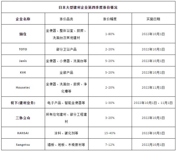 2022年第四季度以来,日本已有多家大型建材企业执行了涨价措施,其中包括TOTO、松下、Housetec、Janis、KVK等卫浴相关企业,中小卫浴企业调整价格的更是不计其数。