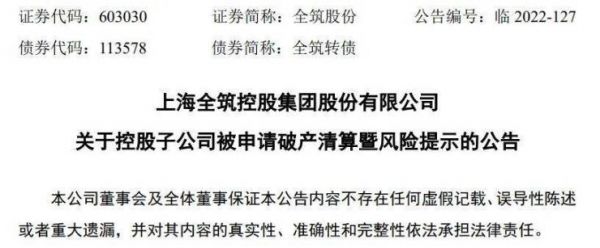 12月8日,全筑股份(603030.SH)公告称,公司控股子公司全筑装饰收到三中院发来的信息,因不能清偿到期债务且明显缺乏清偿能力,全筑装饰债权人南曜实业向法院递交了《破产申请书》。截至2022年10月31日,因内部资金往来形成全筑装饰对公司的应付款项净额约为3.45亿元,若全筑装饰进入破产清算程序,其应付公司的款项可能存在无法收回的风险。