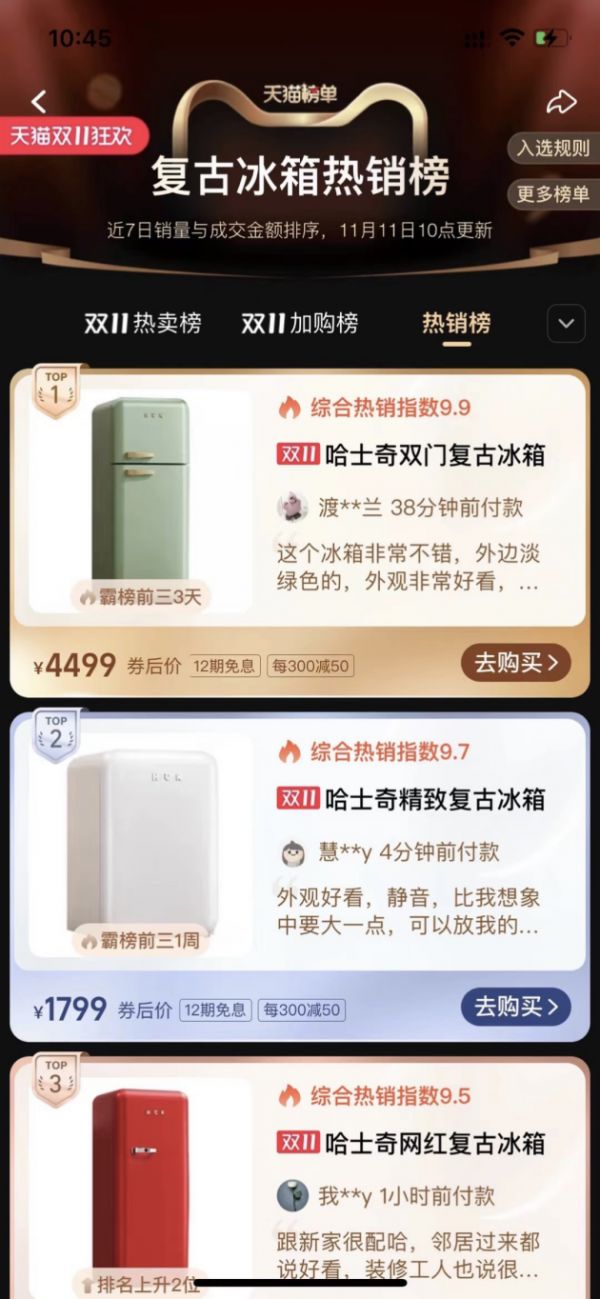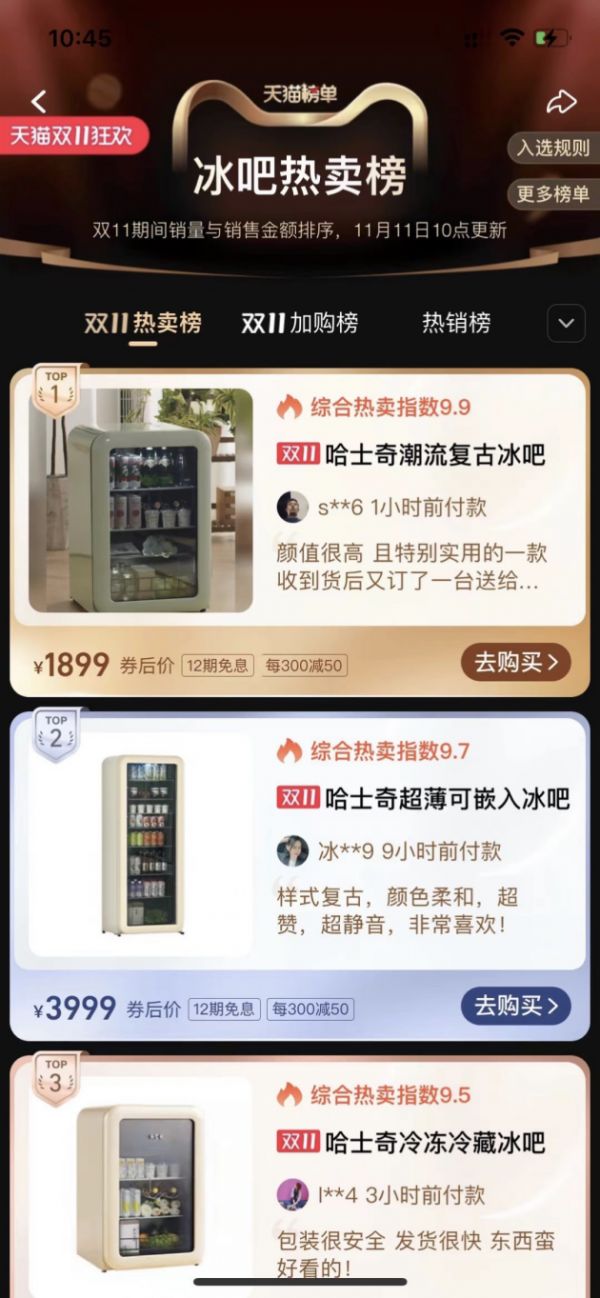 至此,HCK哈士奇就开启了一发不可收拾的霸榜征程!2021年双11,复古冰箱、冰吧在此类目的销量同比增长300%,成为类目第一!2022年的双十一,“冰吧”、“复古冰箱”两个品类,更是把冠军、亚军和季军全部包揽!尽管把4至10名的销售量叠加相比,仍是与HCK产品销售量有一定距离!霸气霸榜,实力不容小觑!因为,消费者总会做出他们认为正确的决定。