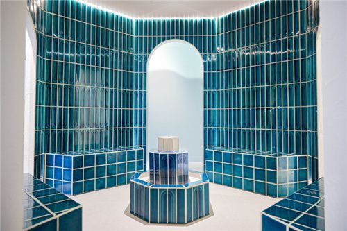 《Transcendence超越》由Nada Debs和科勒WasteLAB共同打造的手工瓷砖建造而成,融合了黄金年代的建筑风格元素。Nada Debs通过对再生瓷砖的重组利用,打造出这套有三个房间的土耳其浴室,这种对于文化和工艺的淬炼,与科勒品牌长久以来的匠心工艺和对环境更友好的承诺一脉相承,从而创造出情感上的共鸣。这些手工定制瓷砖上的拱形设计源自古老土耳其浴室的设计美学,而废旧材料的再生利用与土耳其浴室为身心带来的焕活幸福感,构建起了视觉和感官的互联。