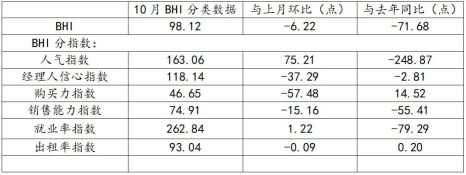 全国建材家居景气指数BHI 10月份为98.12,环比下跌6.22点,同比下跌71.68点。全国规模以上建材家居卖场10月销售额为825.07亿元,环比下跌16.84%,同比下跌42.52%;2022年1—10月累计销售额为10283.81亿元,同比上涨10.64%。10月,多地疫情反复态势延续,全国建材家居消费需求减弱,全国建材家居市场“银十”旺季行情爽约,BHI出现少见下降。