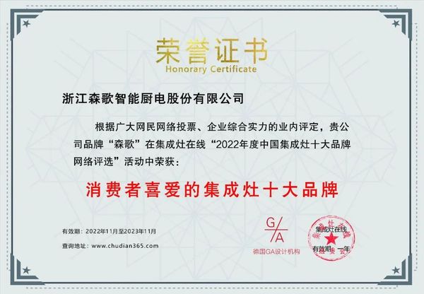 纵观森歌集成灶的产品打造,不难发现,森歌集成灶十分注重保护消费者利益与践行社会责任合一。基于创新科技沉淀之上,森歌集成灶持续打造绿色环保的品质厨电,也因此屡屡收获行业与消费者的高度认可,不仅荣获了浙江制造“品字标”认证,还在第17届建材泛家居行业颁奖盛典上,荣膺“消费者喜爱的集成灶十大品牌”。众多口碑认证,也见证了森歌在高端厨电市场的卓越影响力。