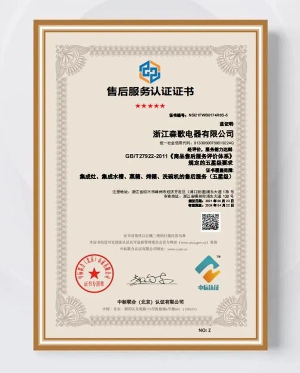 长期专注打造高质量的服务品质,森歌集成灶早已成为行业中的服务标杆。在过去5年中,森歌已连续5次收获五星级售后服务认证,斩获全国售后服务行业十佳单位、全国顾客满意行业十大品牌等诸多口碑认证。在品质产品之外,森歌以服务向善之力,为消费者营造更有品质的理想厨房,尽享美好时光,从中透出的是,一个品牌对用户的诚意,从更大层面来看,更可见其对社会责任的重视。