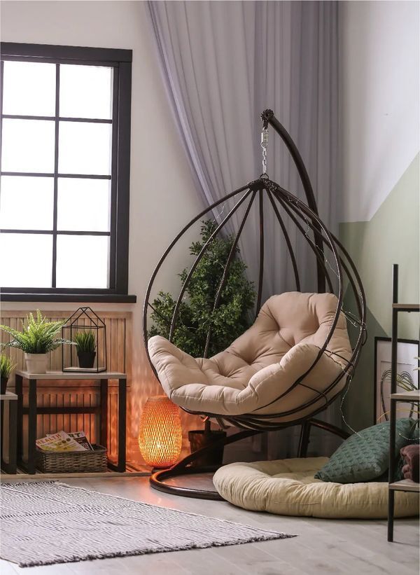 秋千吊椅,是一款兼具浪漫效果与实用功能的家具,很适合放在1㎡的角落里。坐在上面荡几下秋千,既能够舒展身心,又可以开拓思绪。搭配一个小边几,放上咖啡、零食和书籍,一个舒适惬意的1㎡疗愈之境就呈露出来。