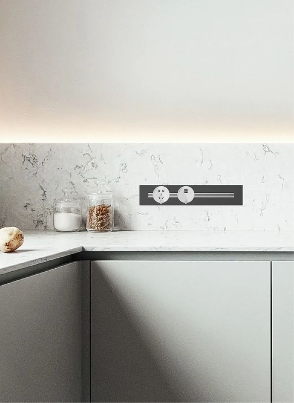 Simon电力轨道插座,让你心仪的所有小家电都能在这1㎡的小空间里找到归属。单轨道最大可承载最大功率为8000W,支持同时使用空气炸锅、三明治机、咖啡机等多个厨房小家电。同时,具备五孔插座及双USB充电插座2种电源插座,可在电力轨道上任意位置随用随插,灵活位移,自由换装。