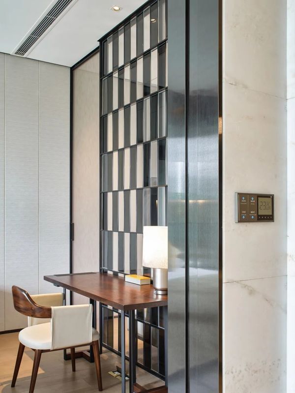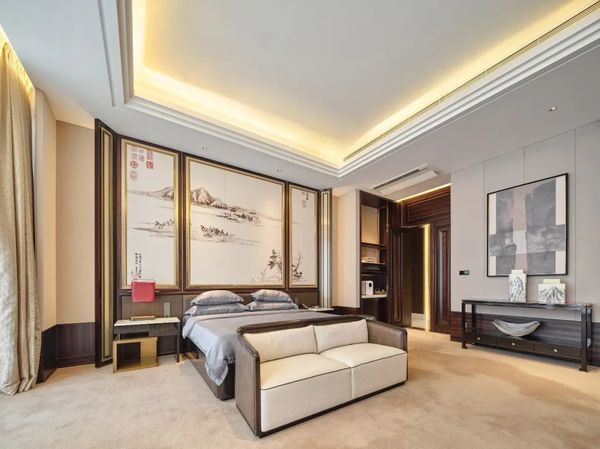 酒店客房内以泼墨山水作为背景墙画,柔和温润的灯光营造出日暖风清的氛围,无不呈现出悠游自得之态,使空间充溢着人文情怀的气息。当人文情怀与智慧科技交融,便诞生了极佳的环境体验。