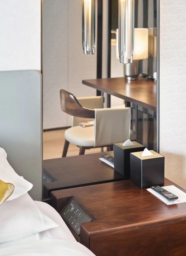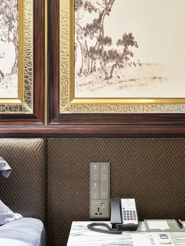 对于酒店的智能化设备来说,“一看就懂”、“轻松上手”也是提升体验感中非常重要的一环。Simon西蒙电气为南太湖山庄打造了专属智能场景开关面板,在床头设置了“明亮”、“舒适”、“影视”及“欢迎”模式,配合宾客休憩、观影、会客等使用场景。同时,还贴心设计了“卧室总开”的按键,一键即可营造舒适睡眠氛围,缓解旅途疲惫。