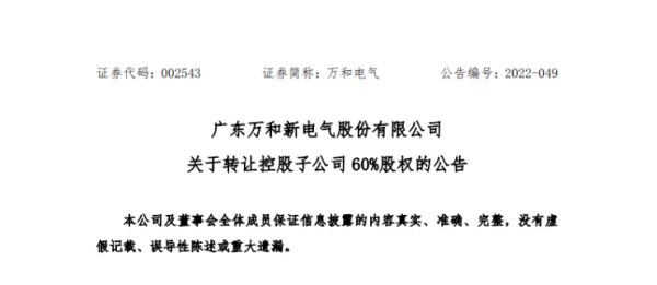 12月12日,万和电气发布公告称,为进一步优化资源配置,实现新能源项目持续动态开发及其业务有序转型发展,公司拟以人民币615万元将持有的控股子公司广东万和新能源科技有限公司60%的股权转让给非关联自然人邓杰彬和余永登,受让的股权比例为 2:1。