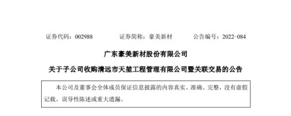12月12日,豪美新材发布关于子公司收购清远市天堃工程管理有限公司暨关联交易的公告。公告显示,根据业务发展需要,公司全资子公司精美特材拟按照广东联信资产评估土地房地产估价有限公司对天堃工程股东全部权益的评估结果4731.96万元,以4731.96万元收购豪美控股持有的天堃工程100%股权。