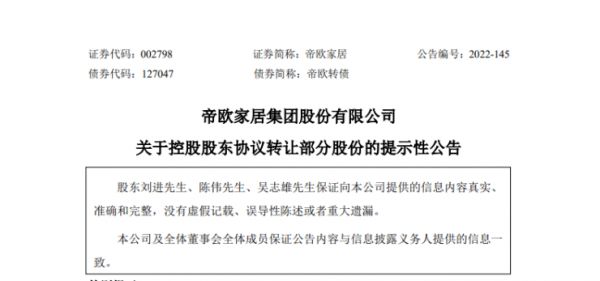 12月12日,帝欧家居披露公告,公司控股股东、实控人刘进、陈伟、吴志雄拟将其持有的7.70%股权,转让给四川资本市场纾困发展证券投资基金合伙企业。公告显示,此次转让价格为7.452元/股,转让价款共计2.21亿元。本次协议转让不会导致公司控股股东、实际控制人发生变更。