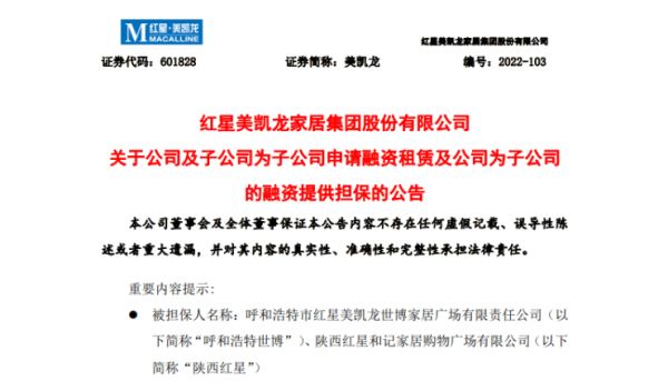 12月12日,红星美凯龙发布关于为子公司申请融资租赁,及融资提供担保的公告,拟为两子公司提供共6.5亿元连带责任担保。公告称,为满足日常经营需求,盘活公司资产,公司与其子公司呼和浩特世博以售后回租方式,将自有标的商场设备等(租赁物)出售给上海大众融资租赁有限公司(大众租赁)并租回使用,公司及呼和浩特世博拟与大众租赁签订《融资租赁合同》,申请为期18个月的融资租赁业务授信额度不超过1亿元人民币。