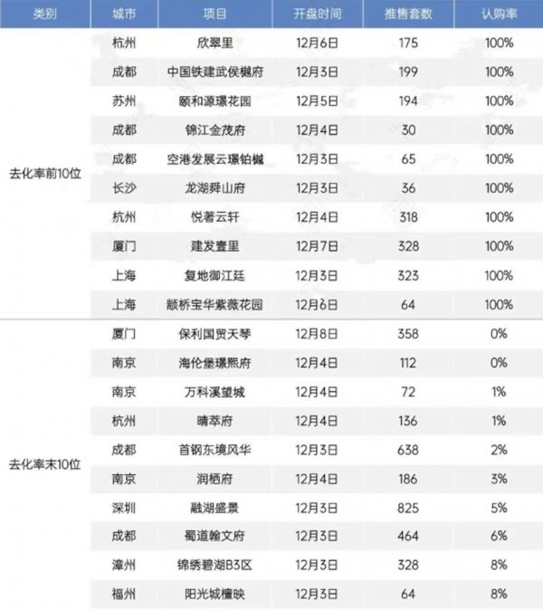 如厦门、成都、杭州等热门城市,既有100%去化项目,也有认购率不足10%的冷门项目。