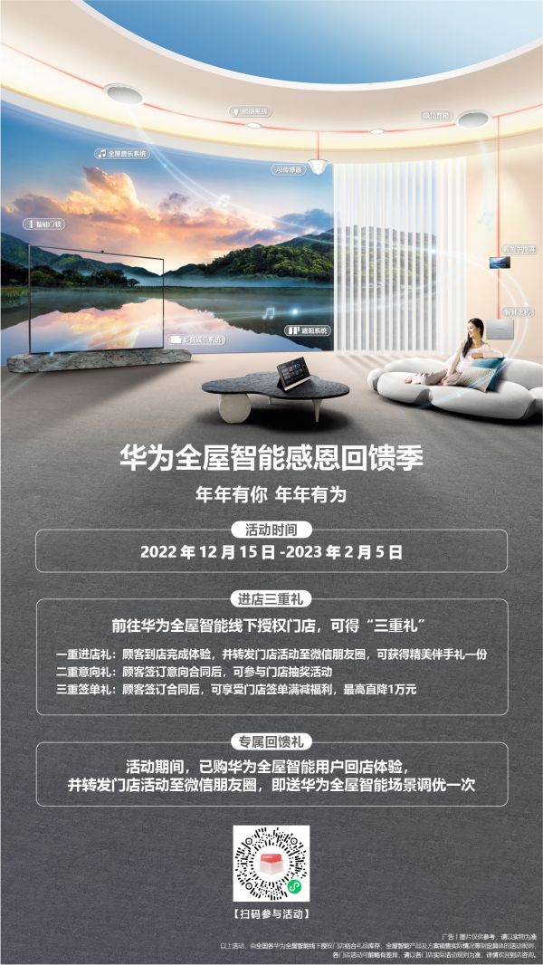 12月15日到2月5日,华为全屋智能感恩季倾情回馈,全国80+城市150+门店,均可线上预约到店体验,打卡分享即可获取多重豪礼。此次活动包含进店三重礼: