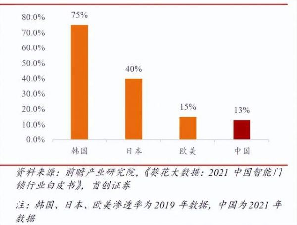 我国智能门锁渗透率较日韩等国家仍有较大差距