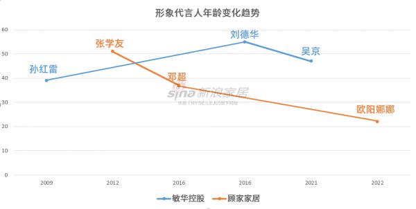 2012年,张学友成为顾家家居大使,当年51岁;2016年,邓超取而代之,当年37岁;2022年,欧阳娜娜成为新大使,时年仅22岁。顾家家居的历届形象大使,呈现出越来越年轻的趋势。并且,到了2022年,变成了女性。