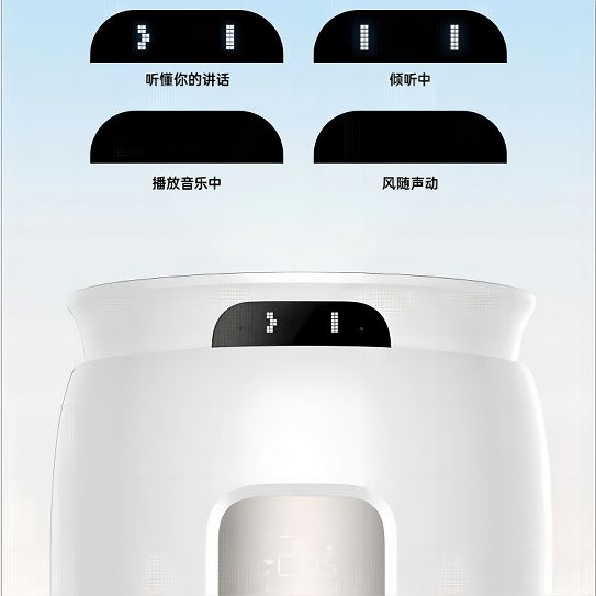 以往语音空调的语音交互并没有明显的动态展现,不能让用户直观地感受到互动过程,如果语音识别度灵敏度高还好,不然可能会影响交互体验。所以TCL“小金聆”智慧语音空调在语音互动过程中,在顶部显示屏植入了Q萌有趣的小蓝翼机器人形象,它可以展现出开机、静默、拾音、音乐律动、定位等动态变化表情,让语音交互过程一览无遗。