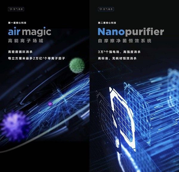 在空气消毒方面,air magic高能离子场域技术和Nanopurifier自摩擦净菌恒效技术实现高效率消杀。50个(3)高能离子电场组合,加上每立方厘米最多2万亿个(4)等离子,让电场间都能储存和释放最大能量,通过局域电场的联动,形成air magic高能离子场域进行多局域联动消杀。后者实现3万个(5)高密度消杀强电场区域,能够引发细菌病毒的蛋白质崩解,加上复合区域的联动能进行强效消杀。系统开启时,高压电场会净化细菌病毒残骸、颗粒物和气溶胶,并且在长时间使用后,不需要替换滤网,清水清理灰尘后即可恢复原性能。