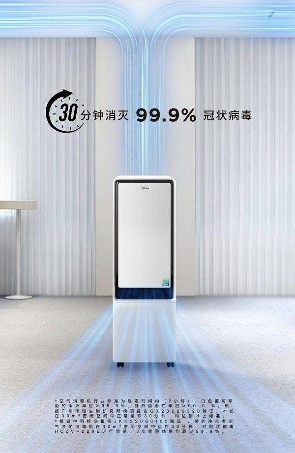 1. 根据中科检测报告JKK22060105验证 ,美的净击者空气净化消毒机在30m³密闭空间中运作30分钟,对冠状病毒HCoV-229E进行消杀,3次实验结果均超过99.9%。