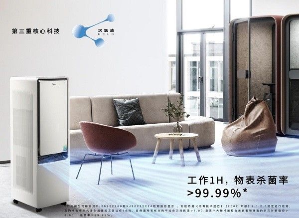 在物表消毒方面,美的净击者空气净化消毒机可产生次氯清。次氯清消杀因子可随风附着于物表,进入病毒和细菌细胞的内部,快速分解DNA并破坏细胞活性,从而高效灭杀物表细菌病毒。