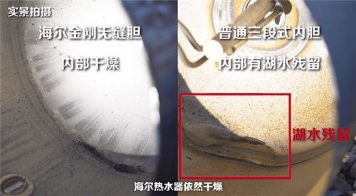 当热水器内胆,遇到100米深水压,究竟会发生什么?普通三段式内胆变形严重,焊缝处漏水;海尔金刚无缝胆毫无变形,滴水不漏。