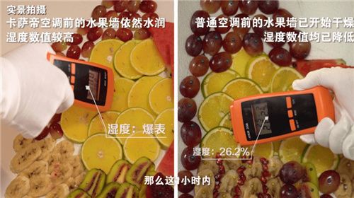 用云南多样水果,打造的“孔雀水果墙”,如何应对空调直吹?传统空调下的水果切片明显干瘪;卡萨帝空调下的水果切片依旧水润。