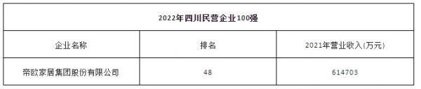 11月18日,四川省工商联发布“2022年四川民营企业100强”榜单。今年四川民营企业100强的入围门槛为29.78亿元,比2021年增加8.97亿元。其中,位于成都的帝欧家居集团股份有限公司上榜,以614703万元的营业收入位列第48位。同时,在11月25日公布的“2022年成都企业100强”榜单和“2022年成都制造业企业100强”榜单中,帝欧家居集团股份有限公司也分别位列第66位和第30位。