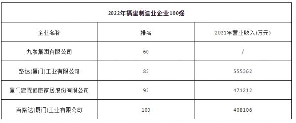 12月7日,2022福建企业100强发布大会在莆田召开,会上发布了2022年“福建企业100强”、“福建制造业企业100强”等榜单。其中,九牧集团有限公司、路达(厦门)工业有限公司、厦门建霖健康家居股份有限公司、百路达(厦门)工业有限公司4家卫浴相关企业入选“福建制造业企业100强”,分别位列第60、82、92和100位。