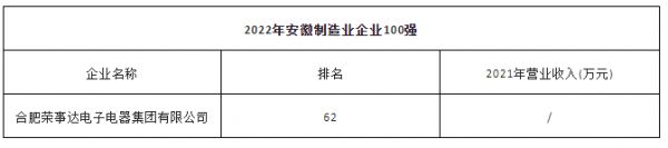 12月12日,安徽省企业联合会、安徽省企业家联合会发布2022年“安徽企业100强”、“安徽制造业企业100强”等榜单。其中,合肥荣事达电子电器集团有限公司登榜“安徽制造业企业100强”,排列第62位。据了解,荣事达有生产卫生陶瓷、水龙头、花洒、水槽、智能马桶、淋浴房等卫浴产品。