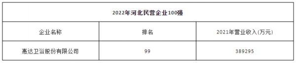 11月4日,河北省工商联发布“2022年河北民营企业100强”榜单,惠达卫浴股份有限公司位列第99位,该公司2021年营业收入为389295万元。