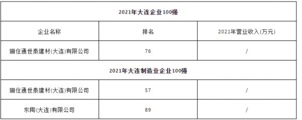 9月30日,大连市企业联合会、大连市企业家协会发布“2021年大连企业100强”、“2021年大连制造业企业100强”榜单,骊住、TOTO在当地的公司入选。其中,骊住通世泰建材(大连)有限公司同时入选“大连企业100强”和“大连制造业企业100强”,分别排名第76位和57位。东陶(大连)有限公司则在“大连制造业企业100强”榜单中位列第89位。