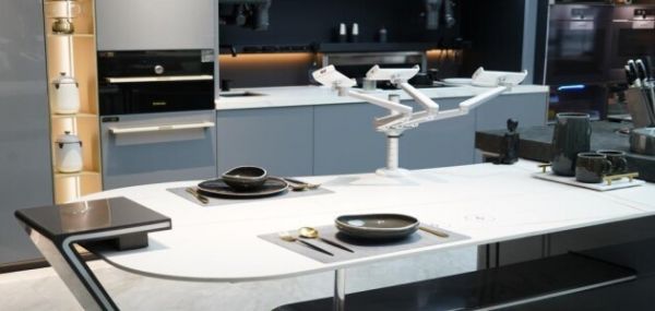 “小屋管家,启动做饭模式”,一声令下,厨房灯光自动调整为最适合的场景亮度,兼具无明火灶台、感应水龙头等操作区的隐形岛台开始工作。岛台台面自动向两侧滑动,原本隐身其中的水龙头、抽油烟机自动升起,在操作区看不到任何燃气灶、电磁炉和物理按键,把锅具放在桌面指定区域,在功能区域内调节温度高低,即可开始烹饪。由岛台延伸出的简致用餐区域,内设隐形加热面板和无线充电系统,可以让美食保持在最佳的温度与口感。