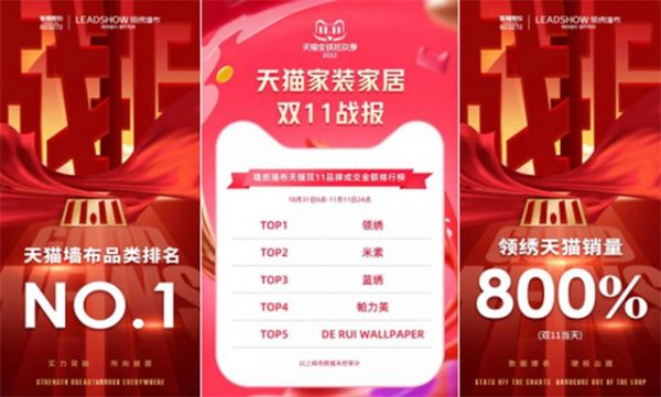近两年,领绣墙布充分利用线上和线下的优势,使消费逐渐从“重商品数量”向“重消费体验”发展。在大家认为软装还属于“获客难、成交难、复购率低、需要眼见为实”的产品时,领绣墙布率先通过线上平台进行直播,推广、种草、带货。在2022年领绣双十一活动中,收获了天猫焕新装修榜榜一、天猫双十一墙纸墙布品类总销量第一、领绣天猫双十一当天销量同比增长800%、全网墙布品类曝光量第一等诸多成果。