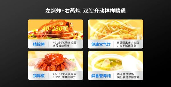 在竞争者众多的蒸烤双腔领域,美大凭借深厚的科技创新团队与前沿的蒸烤技术底蕴,赋予了蒸烤炸炖集成灶引领翘楚的实力本色,突破传统蒸烤独立空间限制,升级90L大容量,39L左烤炸+51L右蒸炖,双腔高效烹饪的同时,容纳更多食材,不仅满足更多烹饪爱好者的需求,也适应现代家庭多场景便捷操作的更多可能。