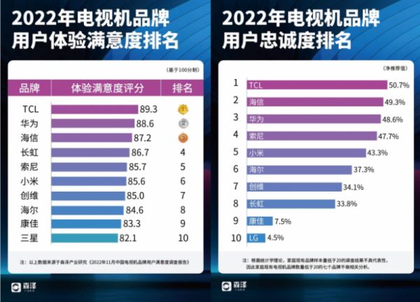 近日,国内知名产业研究调研机构森泽公布了《2022年中国电视品牌用户满意度调查报告》,该报告从品牌认知、使用体验、消费习惯等多个方面对当下电视消费市场进行了全面调查,总结归纳消费者关于电视机的使用体验、NPS净推荐值以及影响消费者对电视机的购买选择影响因素、品牌好感度及形成原因等。