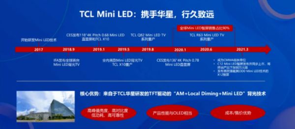 创新求变,科技护航,早在2009年TCL便投资了华星光电,开始面板核心技术的研发,经过十三年的发展积淀后者已成为国内唯一一家能自主生产屏幕面板的电视品牌;同时TCL也加速发展自研技术,在业内率先开启Mini LED的技术研发,2019年成功量产,惊艳世界;2020年TCL Mini LED产品全球销售占比高达90%。
