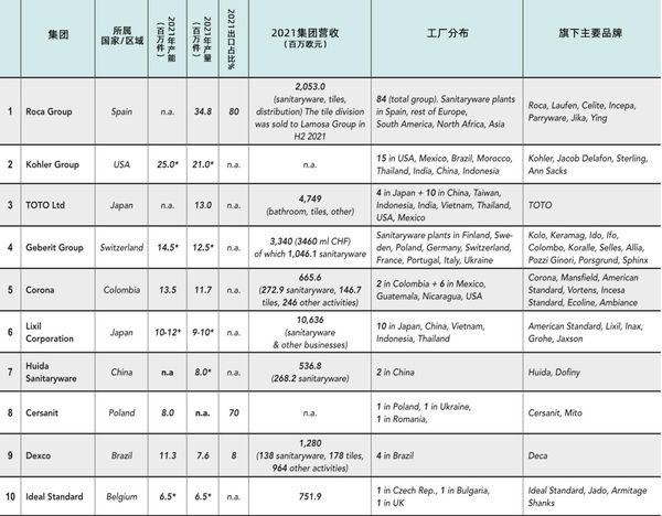 2021年度全球卫生陶瓷集团排名,以截至2021年底的各大卫浴企业卫生陶瓷板块数据为准。乐家、科勒、TOTO、吉博力等国外品牌占据绝大部分位置,惠达卫浴作为唯一的中国卫浴品牌再次上榜,并顺利进入前十,排名高居总榜单第七位,另外两个中国品牌“箭牌”和东鹏分居第11位和第28位。