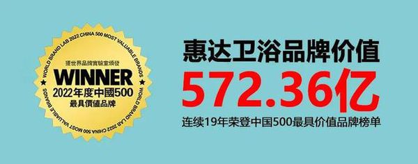 2022年,由世界品牌实验室(WorldBrandLab)主办的“世界品牌大会”上,惠达卫浴凭借572.36亿元的品牌价值,荣登榜单,位列第164名。作为中国卫浴行业领军品牌,惠达卫浴已实现连续19年上榜,且品牌价值及排名屡创新高,俨然已成为中国卫浴的一张闪亮名片,表现出了世界对中国卫浴的高度认可。