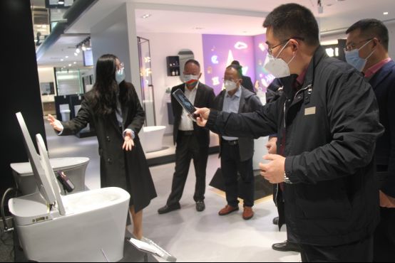 二楼三楼展厅展示了箭牌家居的卫浴板块产品。考察团首先饶有兴致地观看了一款智能马桶360度冲洗演示。360度冲洗技术能全面消除坐便时人体卫生死角,而且这款智能马桶还具有小便检测功能,可即时检出尿液中的红血球、尿酸、尿蛋白等数据,帮助消费者及时掌握自己身体的健康状况。这一先进的智慧化产品引起了考察团连声赞叹。在二楼三楼展示的全新G3管道冲水系统、全智能坐便器V8平台等技术也都处于国际一流水平。考察团还亲自试水,实地体验了具有智慧功能的恒温花洒、浴室柜、浴室镜、淋浴房等品类。
