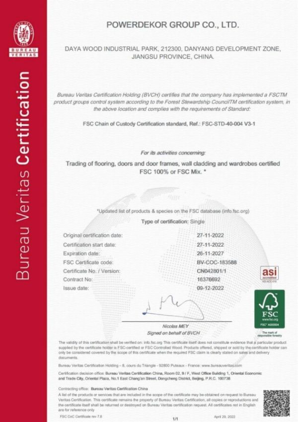 圣象高质量发展源于对绿色产业链的坚持和责任。2022年11月27日,圣象集团有限公司顺利通过全球最为严苛的认证——FSC森林认证中的产销监管链认证,从原木的运输、加工到流通整个链条均得到严格鉴定,圣象地门墙全品类产品均源自于经营良好的森林。此项认证的获得,意味着圣象在对地门墙全品类木材加工各个生产环节均通过了FSC链条监管与确认,更是对圣象高质量发展绿色环保具体行动的又一力证。而对于广大用户而言,选择FSC认证的产品,就是选择环保健康的生活,就是对家人更好的呵护,同时也是一点滴行动践行环境保护。