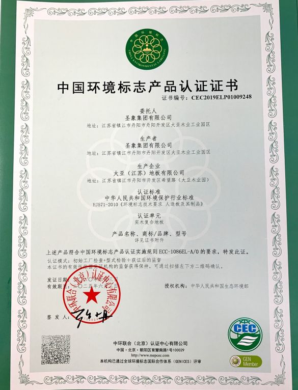 无独有偶,自2000年以来,圣象实业(江苏)有限公司等各工厂均严格遵守中华人民共和国环保部颁布的环境标志技术要求,并通过型式试验、现场审核、产品抽样检验、证后监督等各项严格环节,从而获得中国环境标志产品认证,被业内誉为“十环认证”。这一认证体系从标准和实测监督的角度证明企业环保标准的先进性、环境行为的友好性和持续性,是符合国际标准和被量化的环境行为优的综合体现。可以说,获得“十环认证”的企业是全方位、全流程、全体系可持续发展的标杆企业。