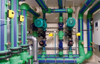 这里所指的是水系统中央空调系统。其运行原理与氟系统空调有着显著的区别,主要由制冷机、冷却水循环系统、冷冻水循环系统、风机盘管系统和冷却塔组成。由于运行原理和结构的特性,水系统空调需要运用大量的管道对水进行传输和循环。不断的水循环和温度变化,使得水机空调对管道的稳定性有着较高的要求。而PPR管耐腐蚀、耐高低温、抗蠕变性能较强、安装和维护便利等特点,很好的符合了水系统中央空调的使用需求。